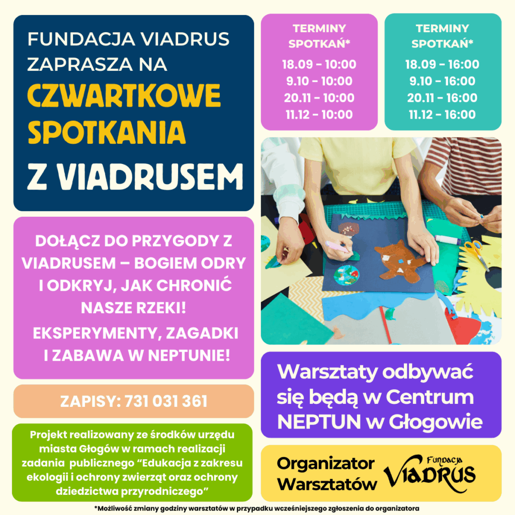 Zapraszamy szkoły i przedszkola na Czwartkowe Spotkania z Viadrusem w Centrum NEPTUN w Głogowie. To cykl warsztatów ekologicznych, podczas których dzieci przez eksperymenty, zagadki i zabawę dowiedzą się, jak chronić rzeki i przyrodę.